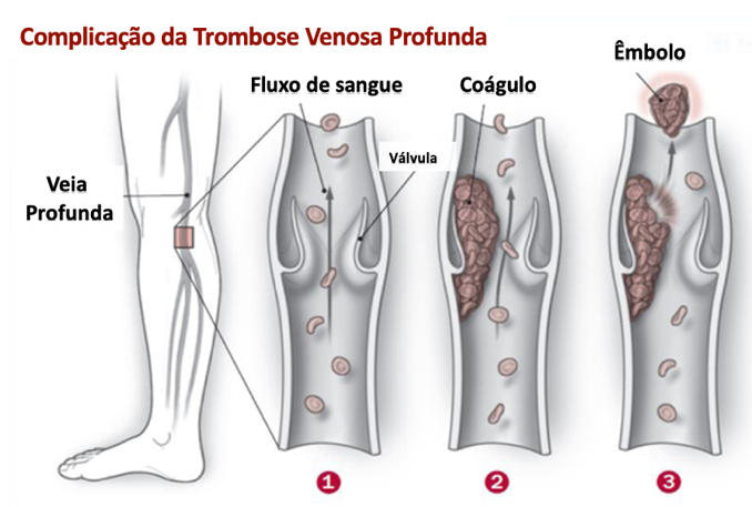 As complicações da trombose venosa profunda, podem ser divididas em agudas, sendo uma das mais temidas, a embolia pulmonar, na qual o coágulo formado se desprende podendo atingir o pulmão prejudicando a circulação do órgão e a oxigenação dos tecidos, levando a dor no peito e falta de ar e dependendo da grau de comprometimento, pode ser fatal. Além disso, quando a trombose acomete uma grande quantidade de veias, a sua progressão pode levar ao prejuízo da circulação das artérias com risco de perda do membro, caso não haja nenhuma intervenção.