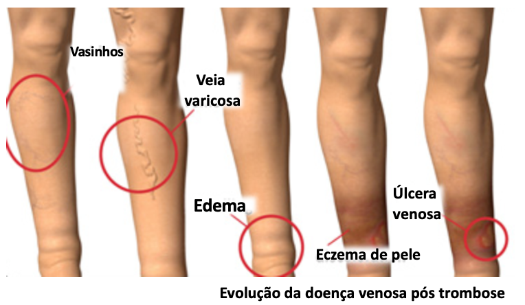 Dentre as complicações crônicas se destaca a síndrome pós trombótica, a qual pode estar presente em até 60% dos pacientes que apresentam trombose na coxa e perna, e se caracteriza por uma lesão na parede interna da veia levando ao seu mal funcionamento e acúmulo de sangue na perna, acarretando em alterações que variam desde inchaço crônico, aparecimento de varizes no membro inferior afetado até alterações de pele como escurecimento da mesma e feridas.