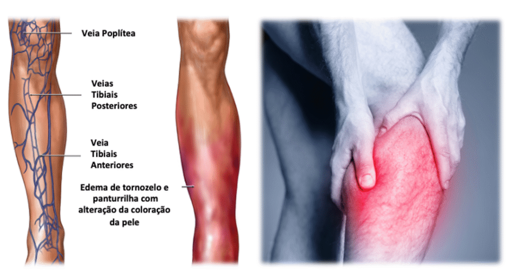 Quando o coágulo acomete os vasos mais profundos, ocorre maior repercussão clínica, sendo as manifestações mais prevalentes a dor e edema ( inchaço ) que ocorre em 86% dos pacientes, podendo também ser observado dilatação de veias superficiais que ocorre em quase metade dos casos e alteração da coloração da pele, porém os sintomas podem ser menos intensos caso o vaso acometido seja pequeno e próximo às extremidades.